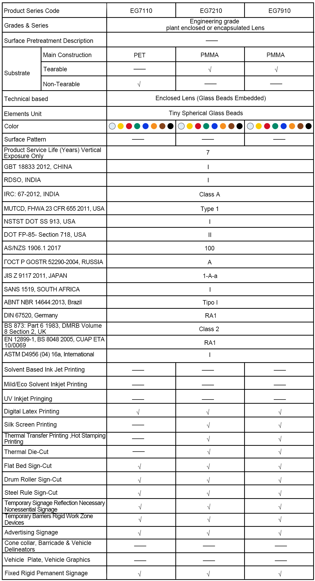 The EG7000 reflective sheeting is available in normal eight colors, with a choice of two substrates: PET, Acrylic. The product is self-adhesive with PSA transparent (Silver) and release liner. The standard available width sizes 0.61m, 0.62m, 1.22m, 1.24m. It is easy to be cutting with computerized plotter and printing with digital printers. It is suitable for applying to the pre-cleaned steel, aluminum and plastic boards (Plastic Boards should be tested for suitability before use).
