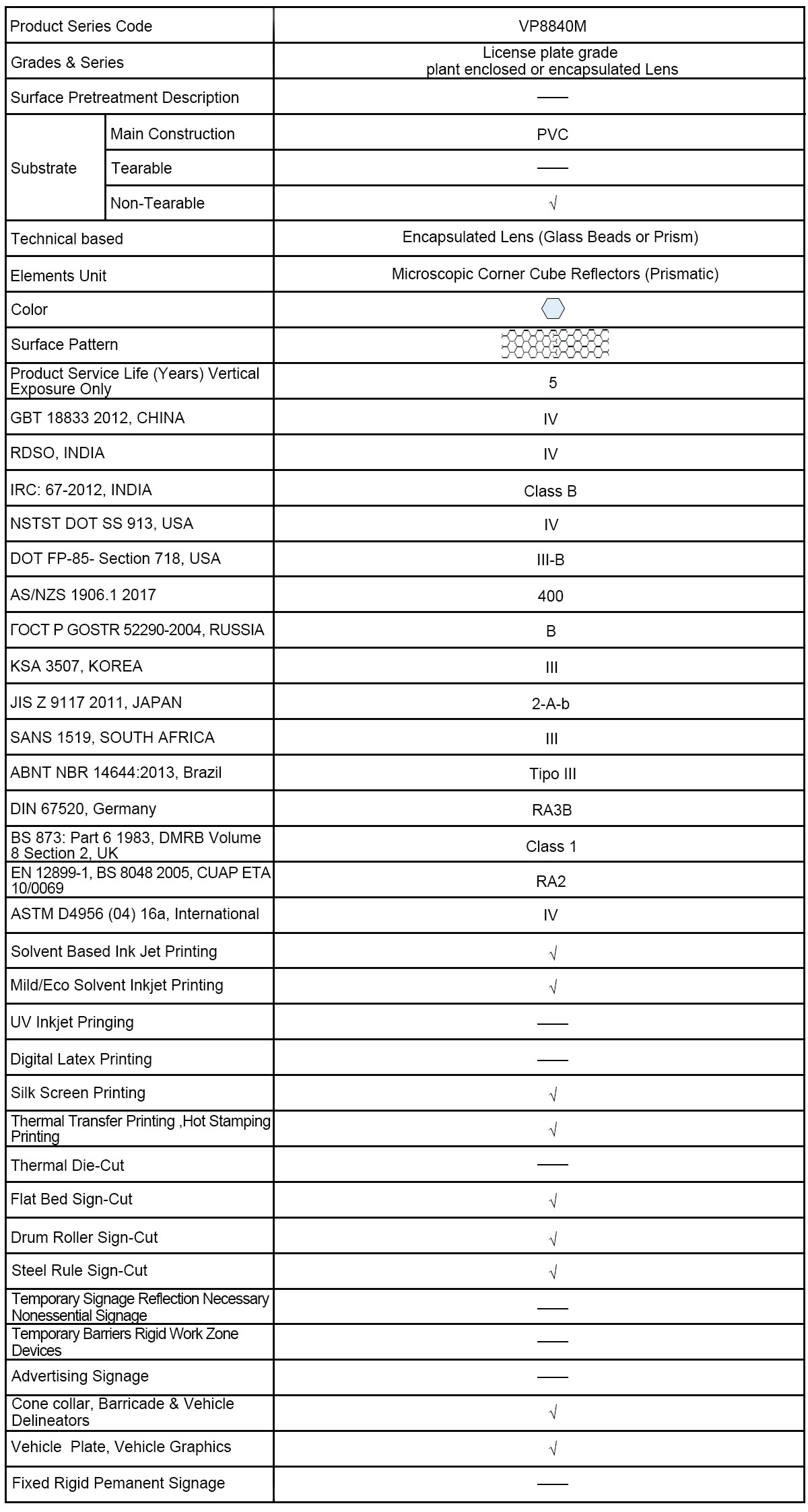 YillumaxTM Vehicle License Plate Grade Reflective Sheeting VP8800M series are three kind of 5 years durable product with encapsulated microscopic corner cube reflectors in a unique coating layer, while it performs very well to return the incident lights overall and can be embossed by pressure machine.