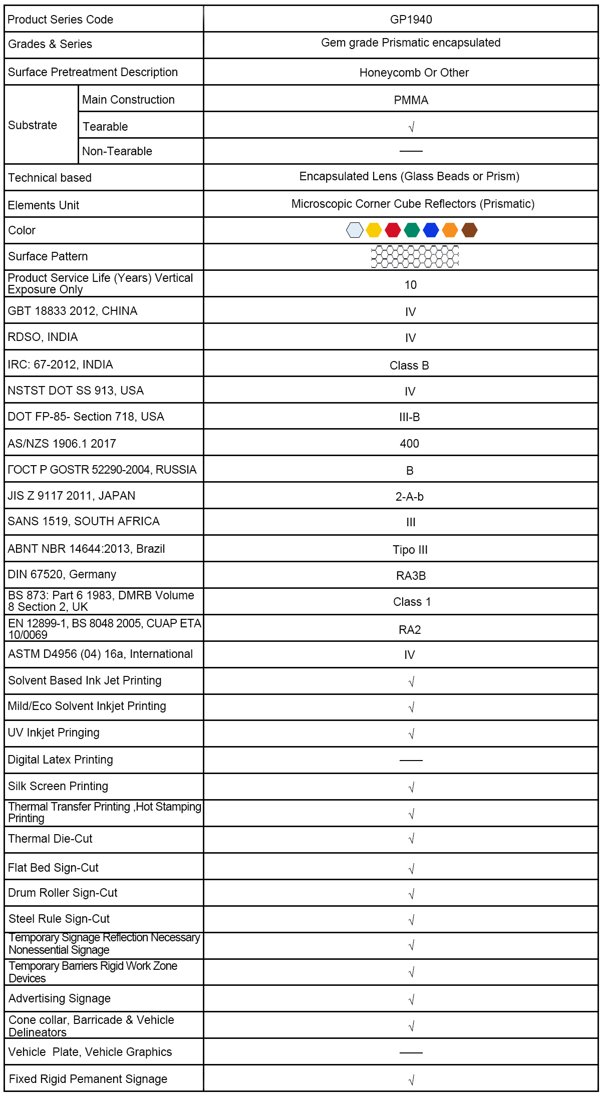 YillumaxTM Gem Grade Reflective Sheeting GP1940 series is a kind of 10 years durable product with encapsulated high reflecting index microscopic corner cube reflectors in a long durable optical coating layer, while it performs very well to return the incident lights overall.