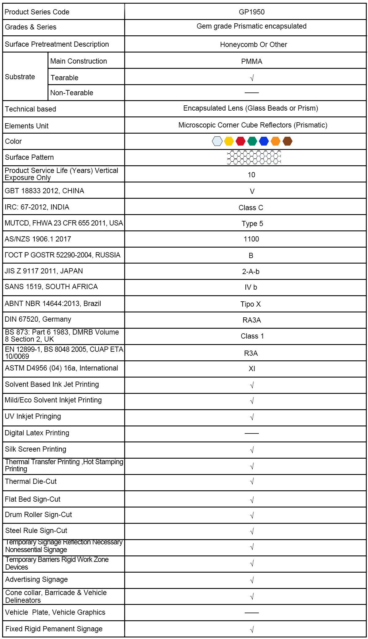 YillumaxTM Gem Grade Reflective Sheeting GP1950 series is a kind of 10 years durable product with encapsulated high reflecting index microscopic corner cube reflectors in a long durable optical metalized coating layer, while it performs very well to return the incident lights overall.