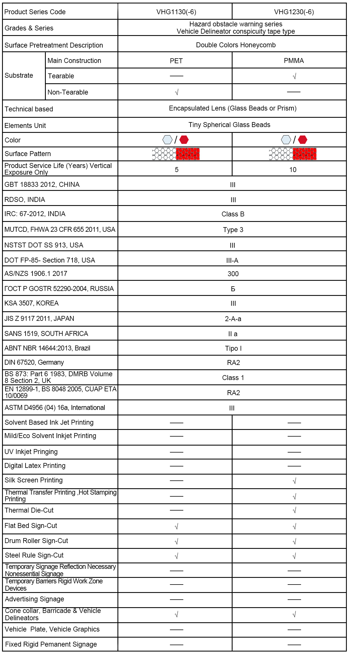 The VHG1130&1230(-6) contour marking retro-reflective tape is available in only white/red, with non-tearable PET and tearable Acrylic substrates and PSA white glue and release liner. The standard available width sizes 5 cm. It is easy to be cutting for using on vehicle body. It is suitable for applying to the pre-cleaned steel, aluminum and plastic surface (Plastic Boards should be tested for suitability before use). More details pls check the overview table or Spec sheet.