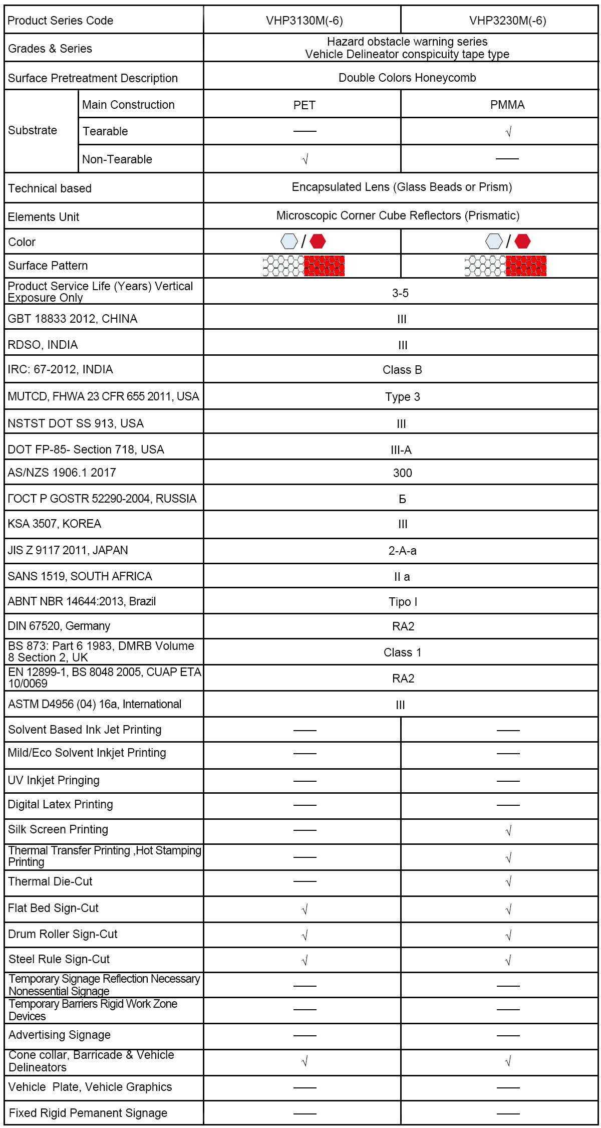 The VHP3130M&3230M (-6) contour marking retro-reflective tape is available in only white/red, with non-tearable PET and tearable Acrylic substrates and PSA white glue and release liner. The standard available width sizes 5 cm.