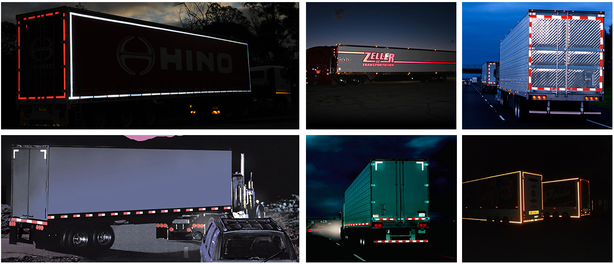 YillumaxTM VGP7950(-M) contour marking retro-reflective tape with high coefficient of retro-reflection values which match the photometric performance of standards: FMVSS 108 with DOT-C2, ASTM D4956 Type III and EN-12899 RA2. The products which are ideal for use as vehicle body conspicuity tape, security wheel rim stripe tape, delineator reflective tape, regulate rear marking plates on trucks, trailers, buses and articulated trucks’ bumper & boards films requiring high visibility, legibility and durability. Different surface film, different reflectivity and different service life provide you different choices. This cost-effective film performs well in many applications.