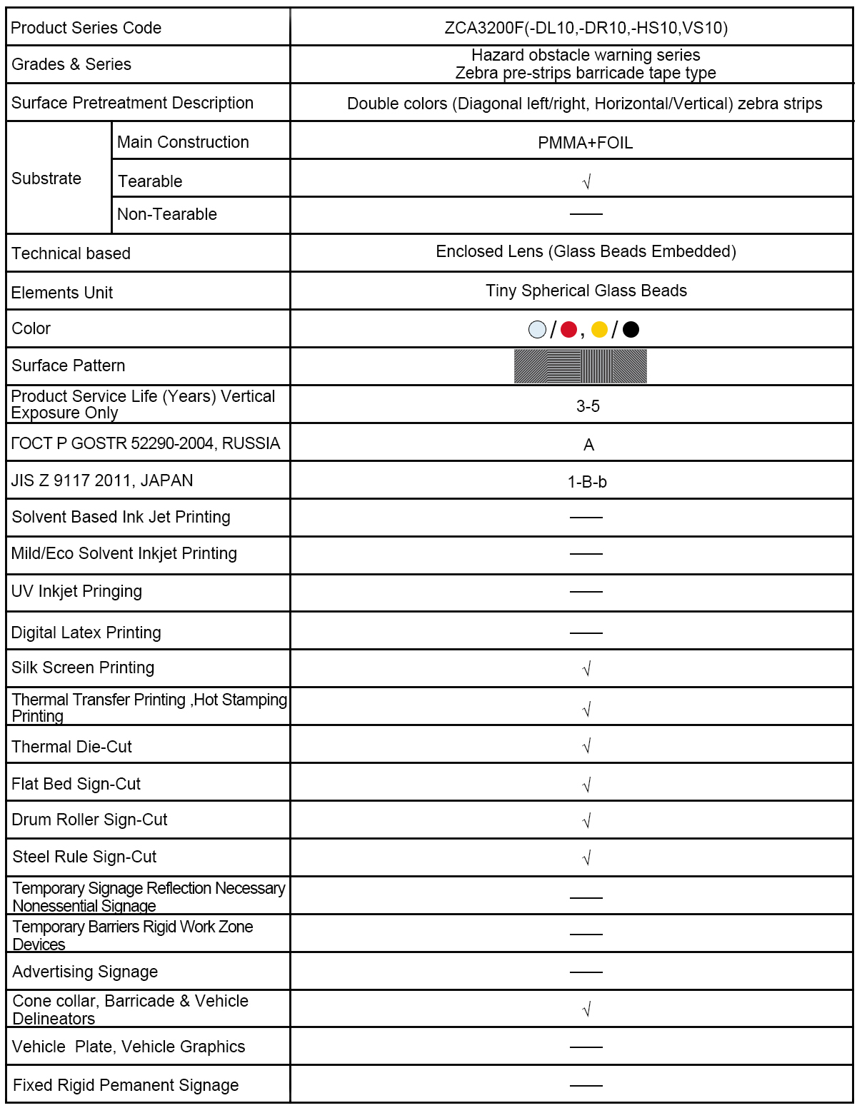 The series reflective sheeting is just customized of different patterns depend on client’s request. We can supply different strips in horizontal or vertical direction, also we can make diagonal strips in left or right directions with customized sizes. Different surface film, different direction of strips for this series provides you different choices (Like ZCA3200F(-DL10, -DR10, -HS10, VS10) etc.). This cost-effective film performs well in many applications.
