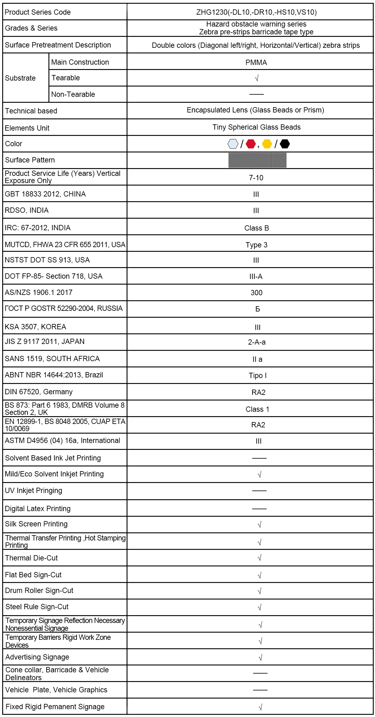 The series reflective sheeting is just customized of different patterns depend on client’s request. We can supply different strips in horizontal or vertical direction, also we can make diagonal strips in left or right directions with customized sizes. Different surface film, different direction of strips for this series provides you different choices (Like ZHG1230(-DL10, -DR10, -HS10, VS10) etc.). This cost-effective film performs well in many applications.