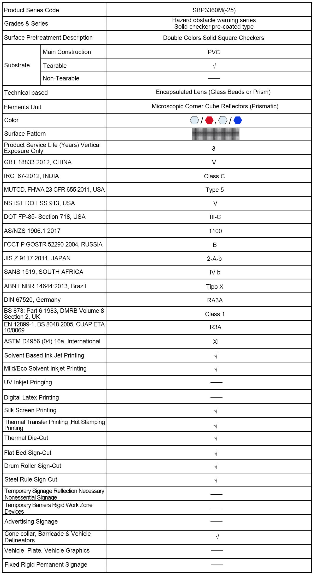 The series reflective sheeting is just customized of different patterns depend on client’s request. We can supply different colors checkers with customized sizes. Different surface film, different direction of strips for this series provides you different choices (Like SBP3360M(-25) etc.). This cost-effective film performs well in many applications.