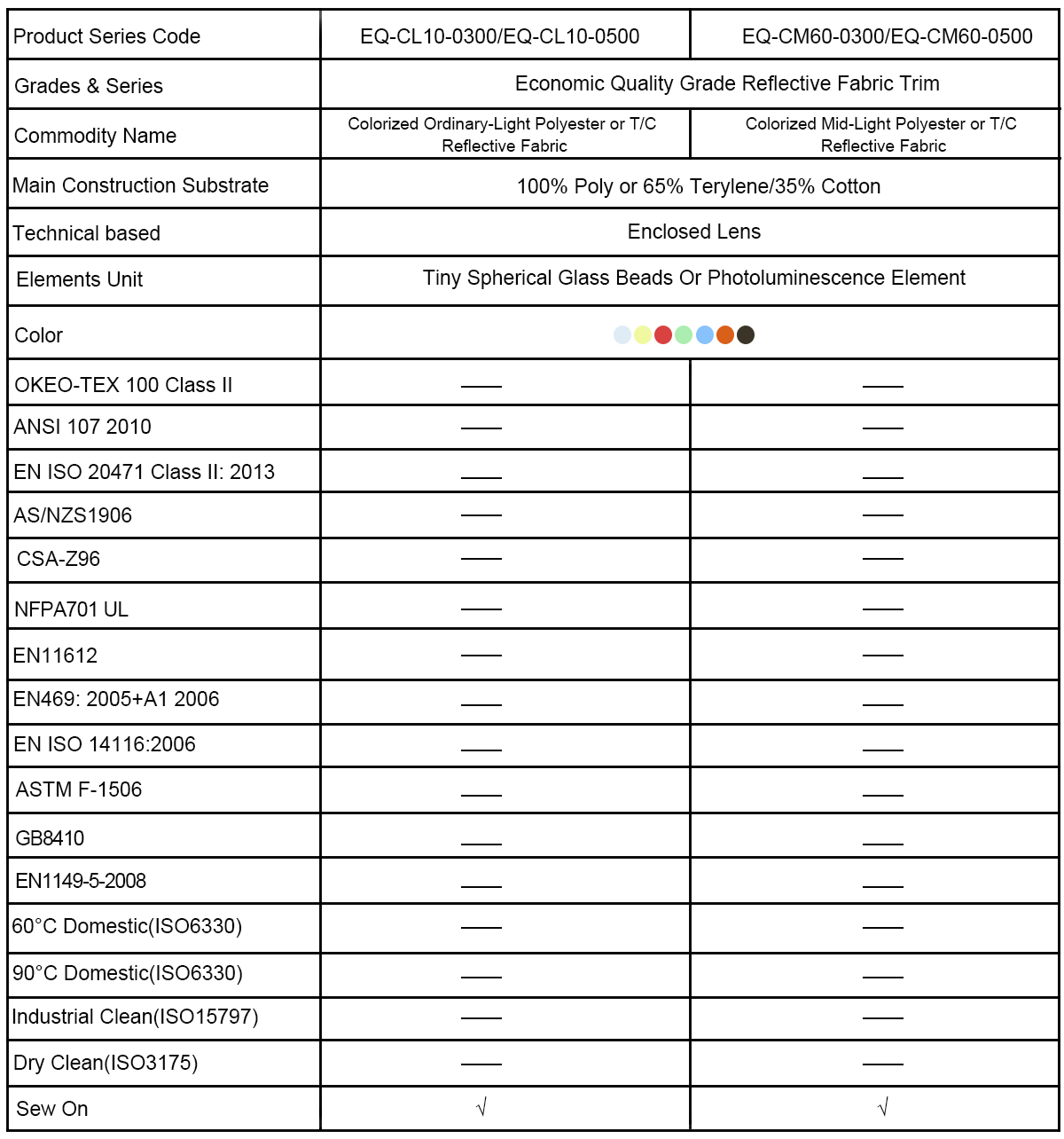 The Economic Quality grade EQ-C-0300/EQ-C-0500 series reflective fabric has a colorized poly or poly/cotton backing and comes in rolls of 200 meters or 100 meters at a standard 50.8 mm width, other widths are available upon request, in a variety of fabrics can be sewn with padding or sewn on to fabrics, such as knit t-shirts, sweatshirts, outerwear for home wash applications. We supply the best qualified reflective fabric consistent performance at a competitive price as always.