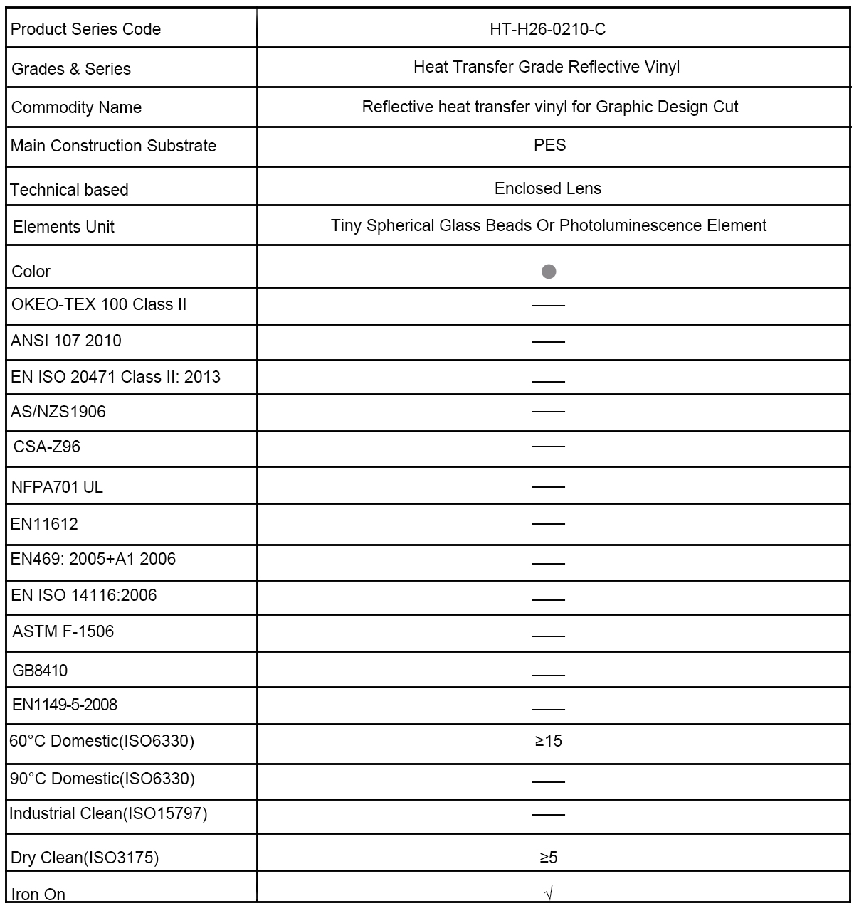 YillumaxTM Heat Transfer Grade HT-H26-0210-C series Embedded semi-enclosed glass beads type reflective heat transfer vinyl trim designed for enhancing visibility in low light and nighttime conditions, bonded to a PES substrate composed with wide-angle and high-refractive index retro-reflective lens of glass beads exposed structure, to improve the wearer is available at night or in adverse environments sight visibility plays a significant role.