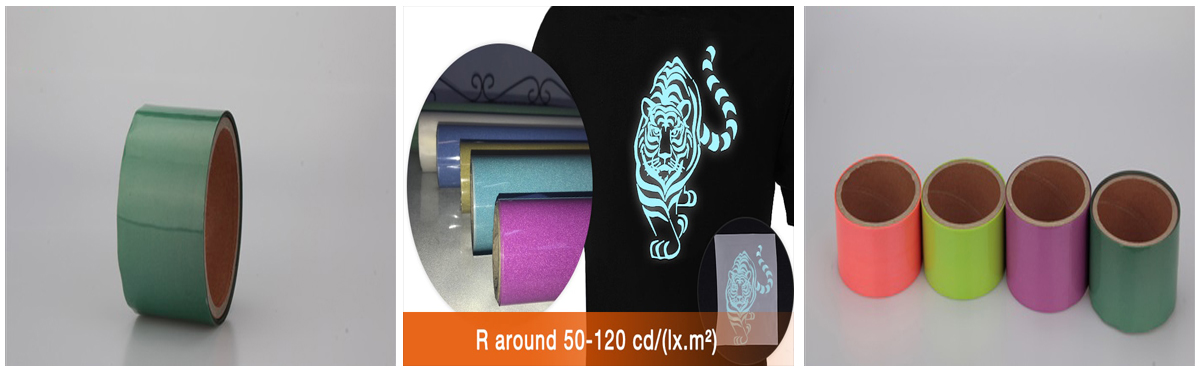 YillumaxTM Heat Transfer Grade HT-CL10(CM60)-0200 series Embedded semi-enclosed glass beads type colored reflective heat transfer vinyl trim designed for enhancing visibility in low light and nighttime conditions, bonded to a PES substrate composed with wide-angle and high-refractive index retro-reflective lens of glass beads exposed structure, to improve the wearer is available at night or in adverse environments sight visibility plays a significantrole.