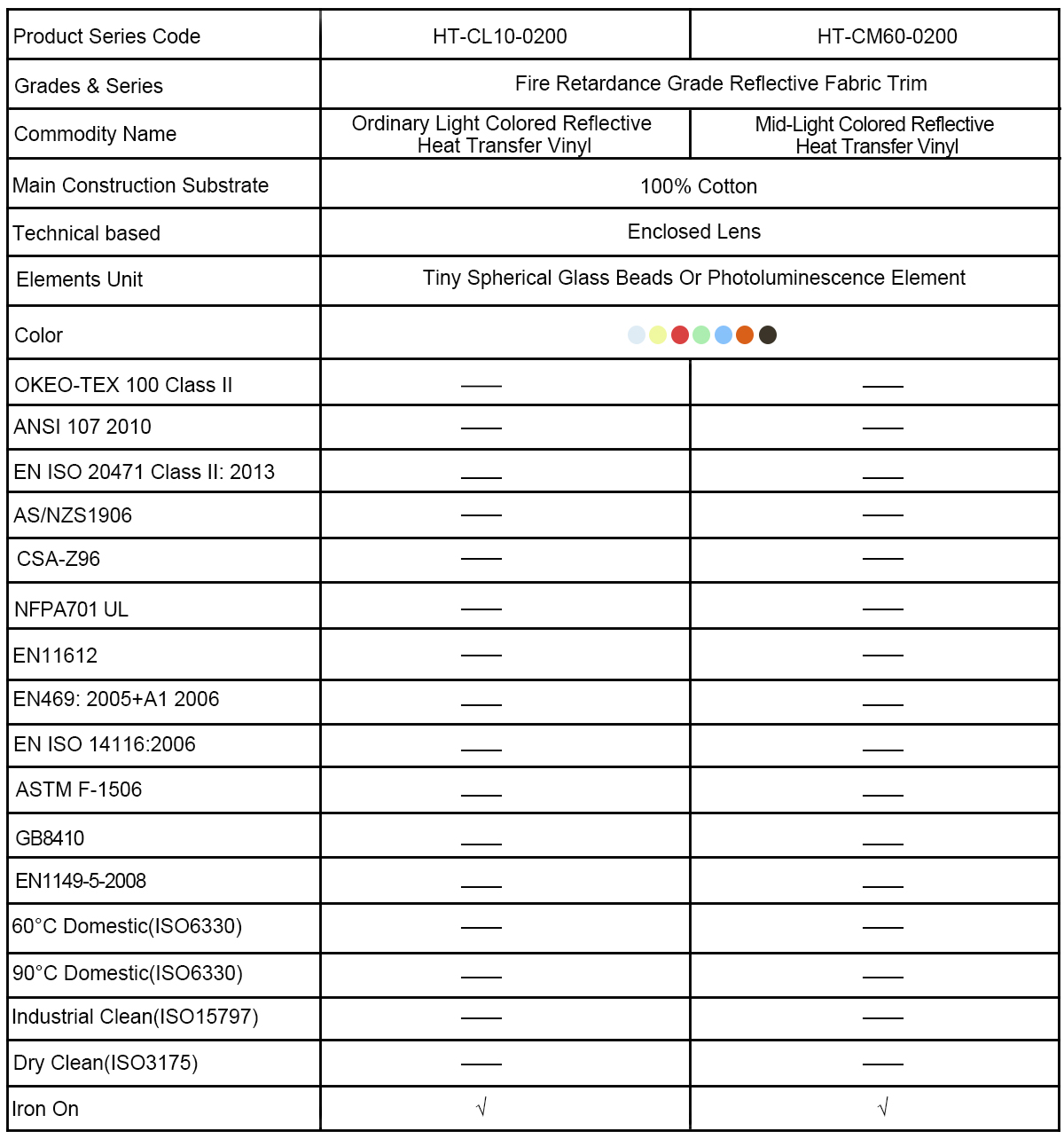 The heat transfer grade HT-CL10(CM60)-0200 series colored reflective heat transfer vinyl has a hot melt adhesive PES substrate and PET carrier film and comes in rolls of 200 meters or 100 meters at a standard 50.8 mm width, other widths are available upon request, in a variety of fabrics can be attached or sewn with padding or sewn on to fabrics, such as knit t-shirts, sweatshirts, outerwear for home wash applications. It is suitable for using a computer or laser to carve a variety of fonts or patterns, and then heat them on all kinds of substrate. We supply the best qualified reflective heat transfer vinyl consistent performance at a competitive price as always.